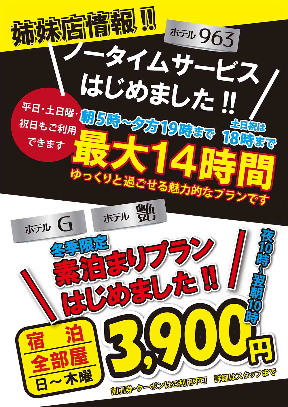 また、「HOTEL G」と「HOTEL 艶」には素泊まりプラン3,900円が登場しました。